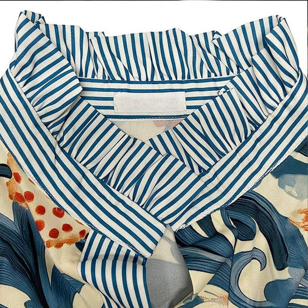 Baroque Floral Satin Blouse – Contrast Stripe Ruffle Collar
