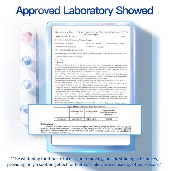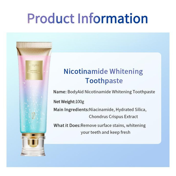 This toothpaste combines probiotics and natural whitening agents including Niacinamide, Baking Soda, and Xylitol. These help restore oral pH balance, remove stains, prevent decay, and relieve gum irritationāgiving you a visibly brighter and healthier smile.