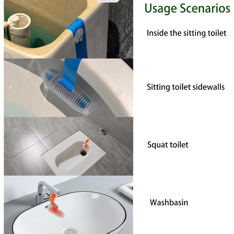 Suitable for use inside the toilet tank, on toilet sidewalls, squat toilets, or even washbasins.