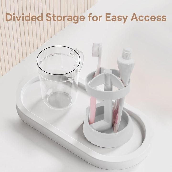 A built-in drip tray collects water, keeping brush heads dry and sanitary. The vertical divider maximizes storage in minimal space—perfect for small bathrooms or shared vanities.